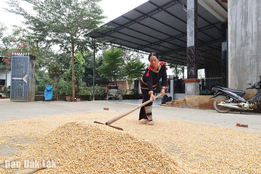 | Chị H'Juôr Khang ở buôn Trấp, xã Krông Ana tranh thủ phơi bắp để có nguồn thức ăn cho chăn nuôi. |