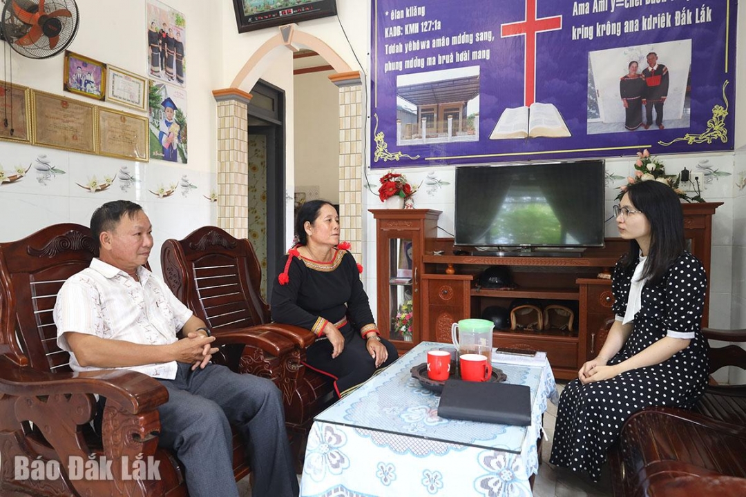 | Chị H'Juôr Khang chia sẻ về những nỗ lực vươn lên phát triển kinh tế gia đình với chuyên viên Phòng Văn hóa - Xã hội xã Krông Ana và Trưởng Buôn Trấp. |