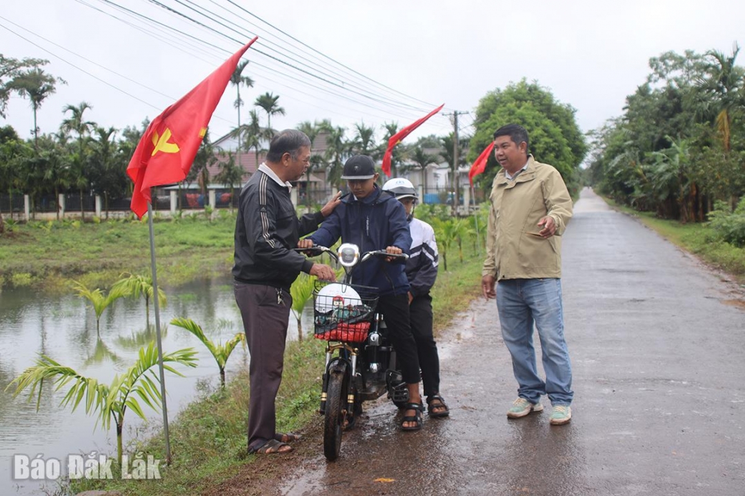 | Già làng Y Jao Ayun (bìa phải) khuyên bảo các em thiếu nhi trong buôn học hành, chấp hành luật giao thông đường bộ. |