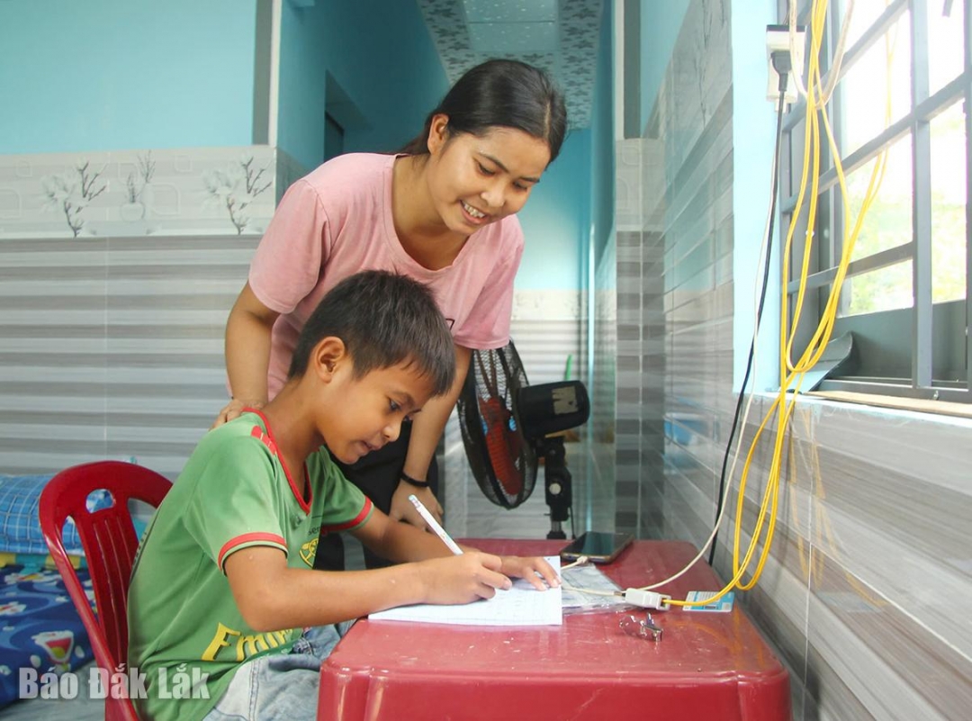 | Chị Mang Thị Mén (thôn Soi Nga, xã Xuân Lãnh) hướng dẫn con trai học bài trong căn nhà mới khang trang. |