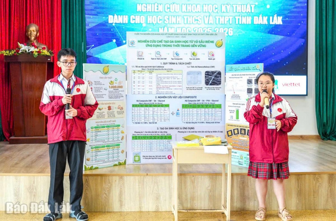Dự án "Chế tạo da sinh học từ vỏ sầu riêng - ứng dụng thời trang bền vững" của các em Nguyễn Đinh Bảo Trân và Nguyễn Xuân Thái (Trường Tiểu học, THCS và THPT Hoàng Việt, phường Tân An) đã mang đến giải pháp cho thời trang an toàn, bền vững khi có thể tận dụng phụ phẩm trong nông nghiệp là vỏ sầu riêng.