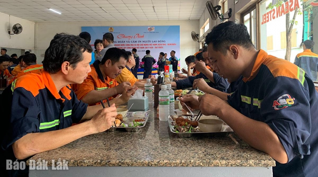 | Người lao động Công ty Cổ phần Thép ASEAN tham gia “Bữa cơm công đoàn” do công đoàn các cấp tổ chức. |