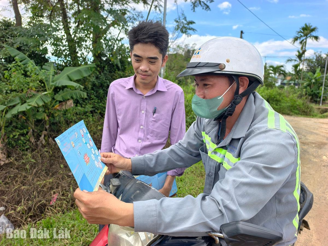 | Cán bộ xã Ea Riêng tuyên truyền, phát tờ rơi giới thiệu về hoạt động đi làm việc có thời hạn ở nước ngoài. |