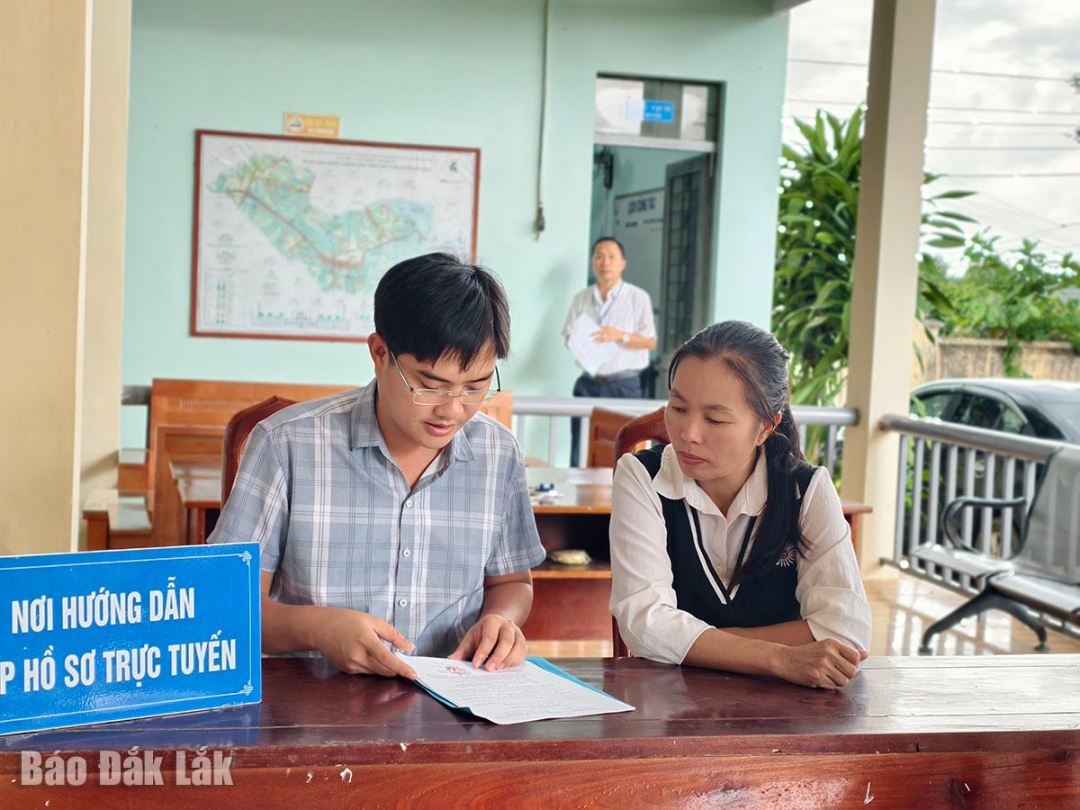 | Cán bộ xã Ea Riêng tư vấn hướng nghiệp cho người dân về chương trình đi làm việc có thời hạn ở nước ngoài đến người lao động. |