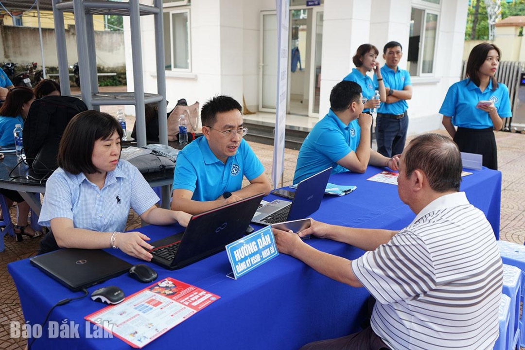 | Nhân viên thu tư vấn chính sách bảo hiểm xã hội cho chủ hộ kinh doanh ở phường Buôn Hồ. |
