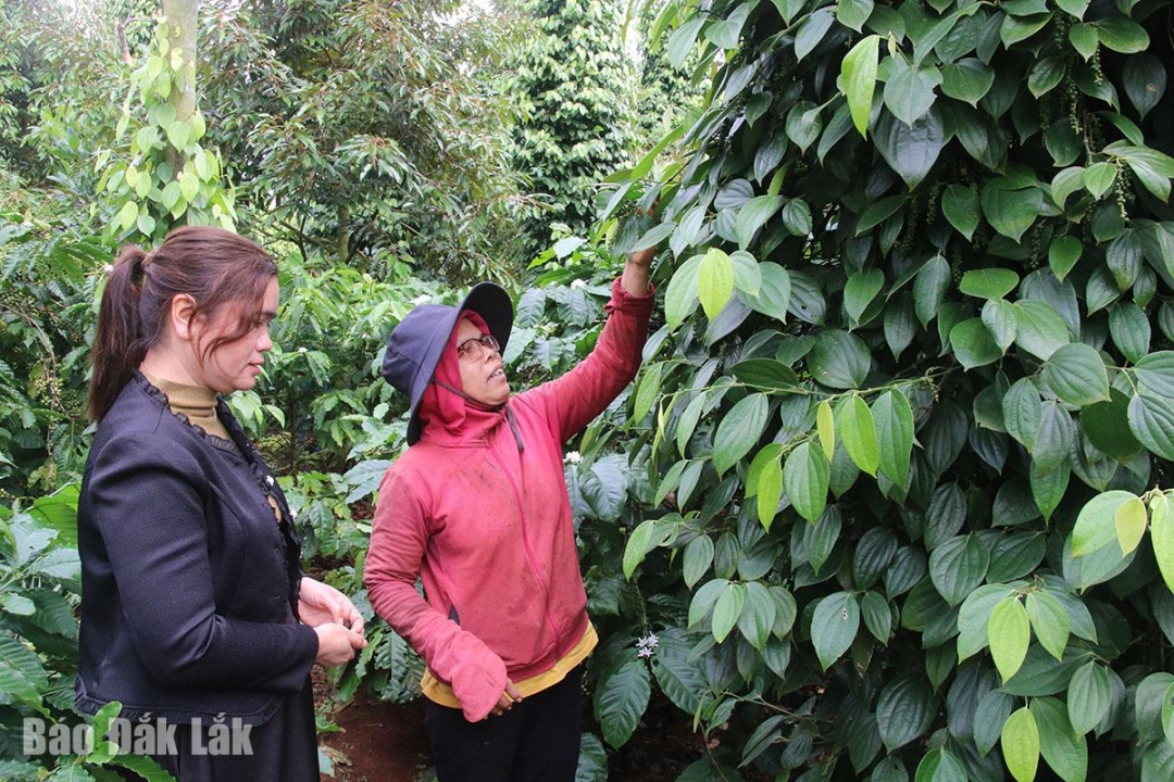 | Ông Y Krang Ông, buôn Liêng Ông (bìa phải) tuyên truyền, vận động người dân trong buôn thực hiện tốt các chủ trương, chính sách của Đảng. |