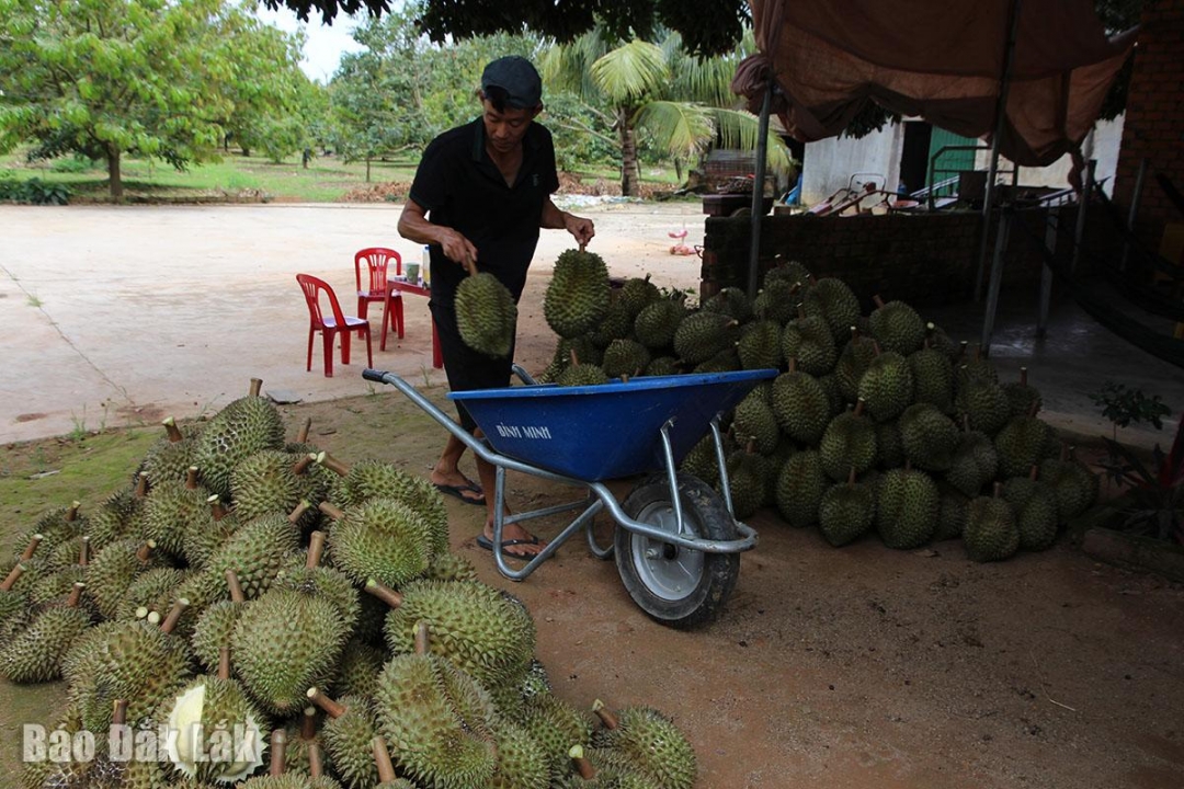 | Thương lái thu mua sầu riêng của người dân trên địa bàn xã Nam Ka. |